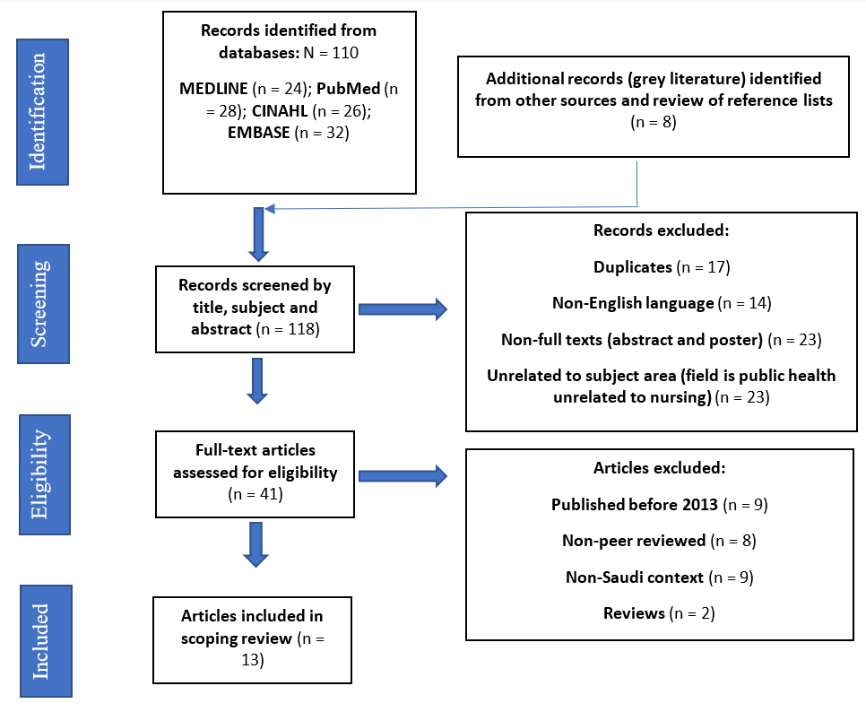 · Geographic Focus: Articles specifically addressing the Saudi context were included, as the target population consists of nurses practicing in Saudi Arabia.