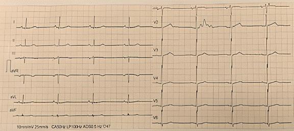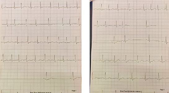 Fue referido a centro de tercer nivel, donde se encontraba asintomático. Fue repetido el ECG evidenciándose una bradicardia sinusal y BIAa (bloqueo del Haz de Bachman) (Figura 1).