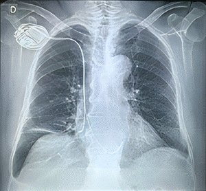 Se decide colocar un implante de marcapaso bicameral, con electrodo auricular en apéndice auricular derecho y con electrodo ventricular en septo ventricular medio, por STB como causa de una miocardiopatía auricular, procedimiento que se efectúa sin ninguna complicación; posteriormente, se realizó una radiografía de tórax, confirmando que el marcapaso y sus electrodos, se encontraban en una ubicación dentro de rangos normales (Figura 4). Fue dado de alta con Apixaban y Bisoprolol.