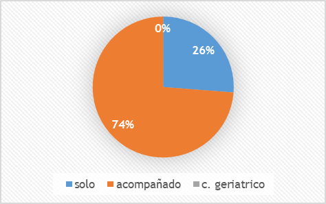 Según los datos obtenidos, la mayoría de los adultos mayores encuestados (74 %) vive acompañada por un familiar o cuidador, mientras que un 26 % vive en soledad, principalmente debido a situaciones como viudez o el alejamiento de sus familiares, generalmente por razones económicas (figura 3).
