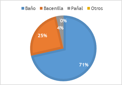 Según la información obtenida, la mayoría de los adultos mayores encuestados (71 %) realiza sus necesidades fisiológicas directamente en el baño tanto de día como de noche, lo que demuestra un nivel significativo de movilidad e independencia funcional (figura 4). Un 25 % utiliza bacenillas, principalmente durante la noche, pero durante el día también acceden al baño. Un 4 % de los participantes emplea otros utensilios para cubrir sus necesidades fisiológicas, mientras que ninguno (0 %) reportó el uso exclusivo de pañales debido a condiciones que les impidieran movilizarse.