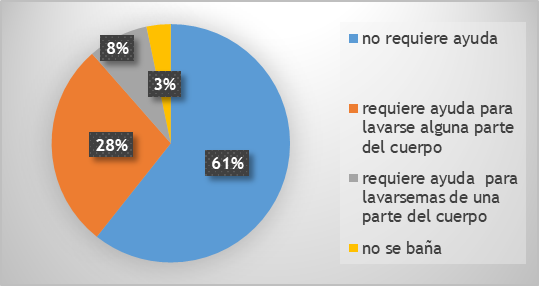 Los datos obtenidos indican que el 61 % de los adultos mayores encuestados no requiere ayuda para bañarse, lo que evidencia un nivel significativo de independencia funcional (figura 6). Sin embargo, un 28 % necesita ayuda para lavar alguna parte del cuerpo debido a limitaciones físicas relacionadas con la edad. Por otro lado, un 8 % depende de asistencia para lavar más de una parte del cuerpo, y un 3 % de los participantes no se baña de forma regular debido a su alto nivel de dependencia y la falta de apoyo.