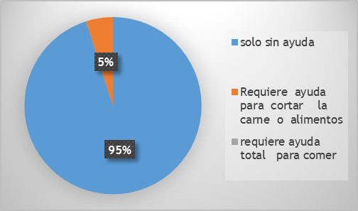 Los datos obtenidos muestran que el 95 % de los adultos mayores encuestados se alimenta de forma autónoma, sin necesidad de asistencia, lo cual evidencia un alto nivel de independencia funcional en esta actividad básica de la vida diaria (figura 8). Solo un 5 % de los participantes reporta necesitar ayuda, principalmente para cortar carne u otros alimentos sólidos, lo que refleja un bajo porcentaje de dependencia.