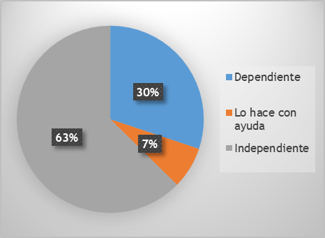 Estos resultados subrayan la diversidad en los niveles de autonomía entre los adultos mayores estudiados. Mientras una mayoría conserva su independencia para realizar actividades de aseo personal, un porcentaje considerable enfrenta barreras que requieren apoyo externo, ya sea de familiares o cuidadores. Este hallazgo enfatiza la necesidad de incluir estrategias de intervención que fortalezcan las capacidades funcionales de los adultos mayores y brinden soporte adecuado a los más dependientes.