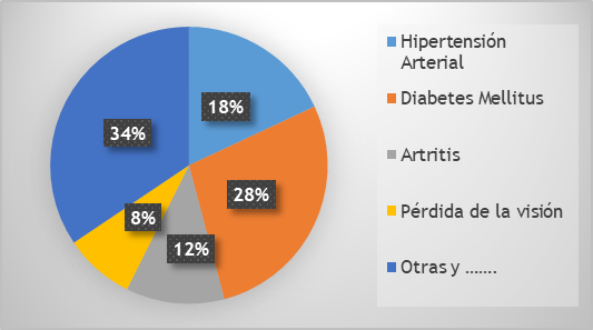 Según los datos obtenidos, el 34 % de los adultos mayores encuestados presenta más de una enfermedad, lo que refleja una alta carga de comorbilidades asociadas al envejecimiento (figura 11). Además, se identificaron las siguientes enfermedades principales: