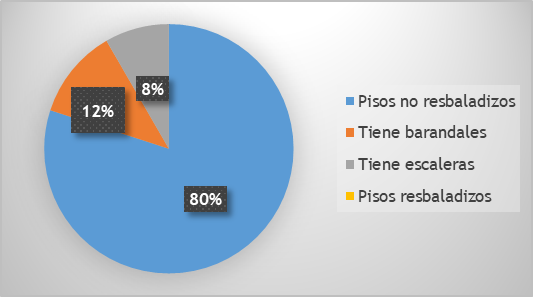 · Pisos no resbaladizos (80 %): la mayoría de los participantes reporta contar con pisos seguros, lo cual disminuye significativamente el riesgo de caídas. Sin embargo, es importante resaltar la necesidad de evitar elementos como alfombras sueltas que puedan incrementar el peligro de lesiones.