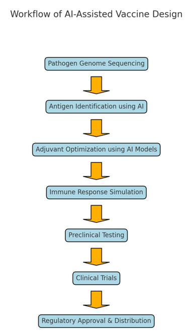 AI has the potential to transform this paradigm by streamlining antigen discovery, optimizing adjuvants, and simulating immune responses in silico.(10) For example, machine learning algorithms can analyze massive datasets from pathogen genomes to identify conserved regions with high immunogenic potential, significantly reducing the time required for vaccine candidate selection.(29)