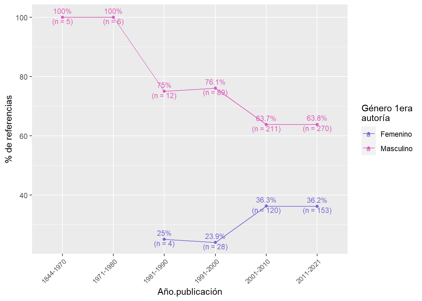 En todas las áreas de formación, se observó una mayor proporción de primeras autorías masculinas, destacándose Ciencias con un 81,9 % de autoría masculina (Figura 1). Esto puede deberse a que en la bibliografía de esta área predomina la literatura consagrada, cuyo canon ha sido dominado por varones.(12) La presencia de autorías femeninas en la bibliografía se evidencia a partir de la década de 1980 (Figura 2), pero su representación no ha variado significativamente hasta la actualidad, según el análisis bivariado y el modelo de regresión (IC95 % = 0,996 - 1,039), lo que indica que el aumento de autorías femeninas en años recientes no es estadísticamente significativo.