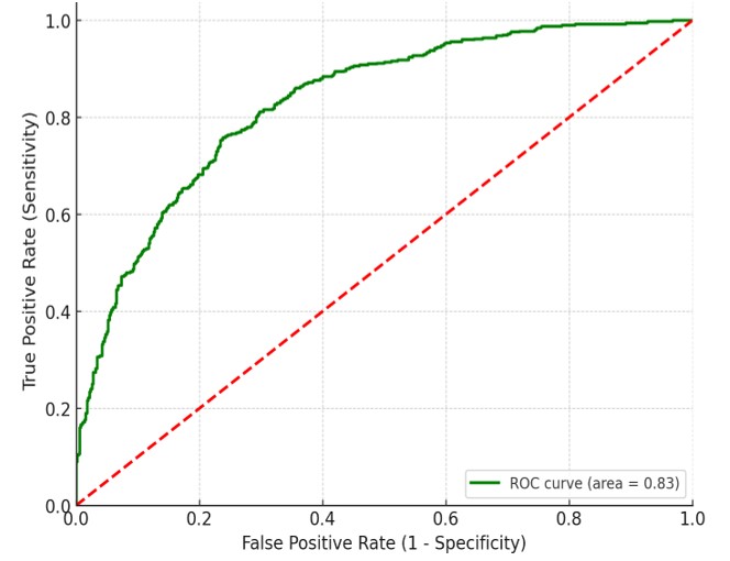 ROC curve to determine fluid responsiveness with an AUC of 0,83, CI (0,804-0,917), a sensitivity of 82 %, and a specificity of 83 %. Overall, the ROC curve indicates that APFV is a valuable tool for assessing fluid responsiveness in pediatric septic shock patients.