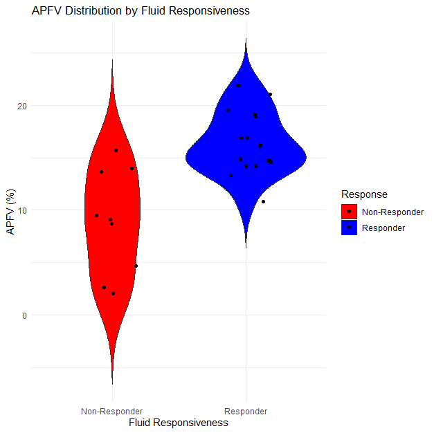 The plot visualizes APFV distributions for two distinct groups – those who responded to fluid therapy (responders) and those who did not (non-responders). This differentiation is crucial in understanding how APFV values correlate with fluid responsiveness. The 'violin' shape for each group shows the density of data points at different APFV levels. A wider section of the violin indicates a higher concentration of patients at that APFV value. Conversely, a narrower section means fewer patients had APFV values in that range.