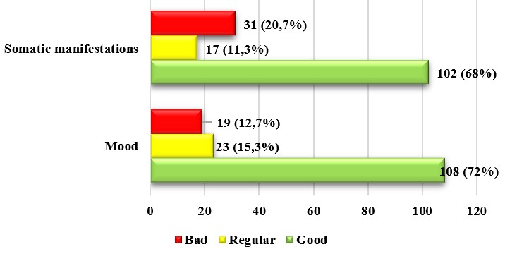 Figure 2 shows the dimensions on quality of life in hypertensive university students, where in the dimension somatic manifestations, 68 % (n = 102) people with hypertension have a good quality of life, 3 % (n = 11) people with hypertension have a regular quality of life and 20,2 % (n = 31) people with hypertension have a poor quality of life. Regarding their mood dimension, 72 % (n=108) people with hypertension have a good quality of life, 15,2 % (n=23) people with hypertension have a regular quality of life and 12,2 % (n=19) of people with hypertension have a poor quality of life.