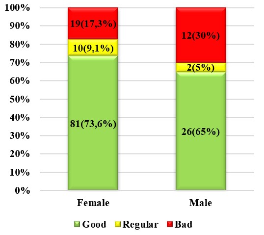 Figure 3 shows the sex of people with hypertension in the study related to quality of life where, 73,2 % (n=81) of females have a good quality of life, 9,2 % (n=10) a regular quality of life and 17,2 % (n=19) have a poor quality of life; With respect to the male sex, 65 % (n=26) have a good quality of life, 5 % (n=2) have a regular quality of life and 30 % (n=12) have a poor quality of life.