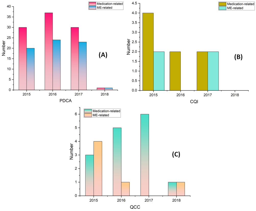Quality enhancing resources: "Plan-do-check-act (PDCA)," "quality control circles (QCCs)," and "continuous quality improvement (CQI)" were all used as quality improvement tools. The separation of Nursing ran 1 289 quality development programs from 2015 to 2019; these included 1 123 PDCA, 176 QCCs, and 88 CQIs. There were 99 programs pertaining to medications, 69 of which were devoted to ME prevention (figure 1).