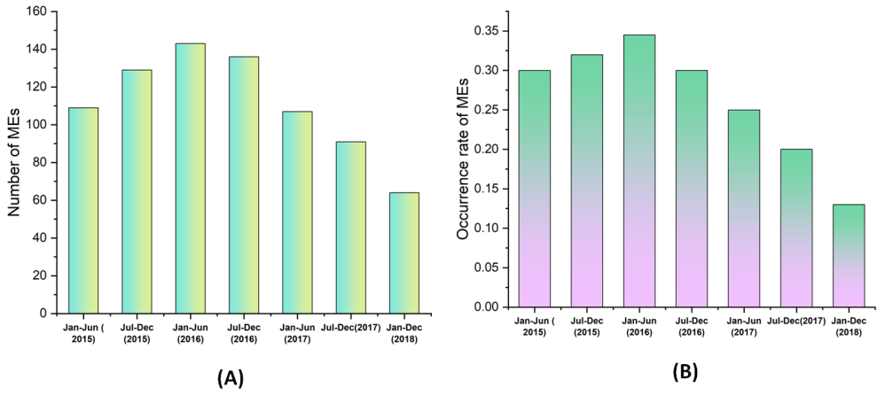 47 % to 69 % of all MEs occurred between 8 anti-meridians and six post-meridian. The January-June of 2016 compared to the January-June of 2018, respectively, showed a substantial continuous decline in the occurrence of MEs among seven anti-meridian and five post-meridian, but not between 5 post-meridian and seven anti-meridians. During the January-June of 2018, there were 50 % fewer MEs between 5 post-meridian and seven anti-meridian, and the incidence rate of MEs decreased in tandem (P<0,05).