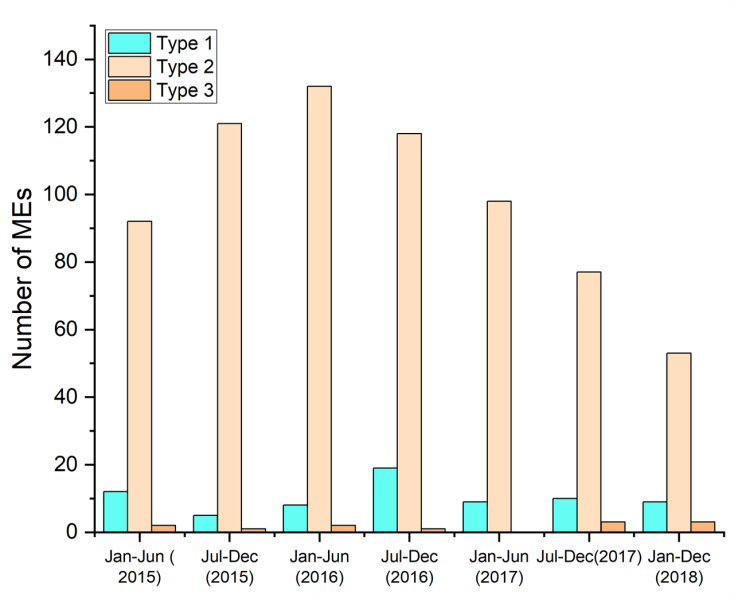 Between 2015 and 2018, no kind four mistakes occurred. In all MEs between 2015 and 2018, type 2 mistakes made up the majority of cases, followed by type 1 errors and type 3 errors. From the January-June of 2015 to the January-June of 2016, there was an upward trend in the number of type 2 mistakes. The frequencies of type 2 mistakes over this time, however, did not alter statistically significantly (P < 0,05). From 133 in the January-June of 2016 to 53 in the January-June of 2018, type 2 mistakes fell steadily (figure 4), with a statistically significant reduction in the incidence rate, P<0,05.