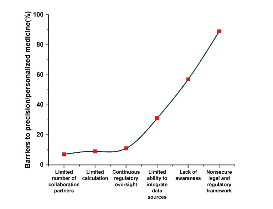 Figure 1 denotes the barriers to precision and personalized medicine and table 2 denotes the values of PM. The rise in the incidence of various kinds of cancer, the low cost of personalized medicine treatment for cancer drugs and other disease indications, a reduced danger of side effects from personalized medicine treatment, the high adoption in developed markets, and the development of novel drugs are the main factors driving the global personalized medicine market. In the coming years, the industry is projected to be constrained by fierce competition, stringent government regulations governing product permission, and an absence of knowledge between the rural populace in emerging countries. Because it can target cancerous areas, tailored medicine is expected to become much more widespread throughout the projection period. The global market for personalized medicine will also grow as a result of lowered adverse side effects and a high acceptance rate in developed economies.