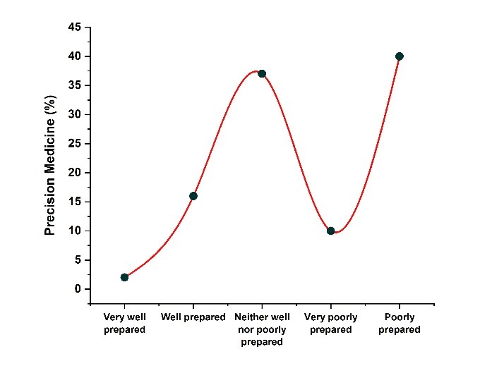 The figure 3 denotes the split of trainee outcomes depending on well prepared to practice PM in the future and the table 4 represents the numerical results of PM trainees. Only 25 % of participants believed they fully understood the implications of mainstreaming genomic treatment for clinical practice in the future. Although more senior trainees than junior trainees are likely to comprehend what genetic mainstreaming means (28,8 % vs 15,3 %), this variation did not reach statistical importance. Comparing trainees with a Master’s or Ph.D. to those with a BSc or no further degree, similar results were found. Furthermore, just 11 % and 18 % respectively, of participants think that their local training program effectively arranges them to apply personalized healthcare.