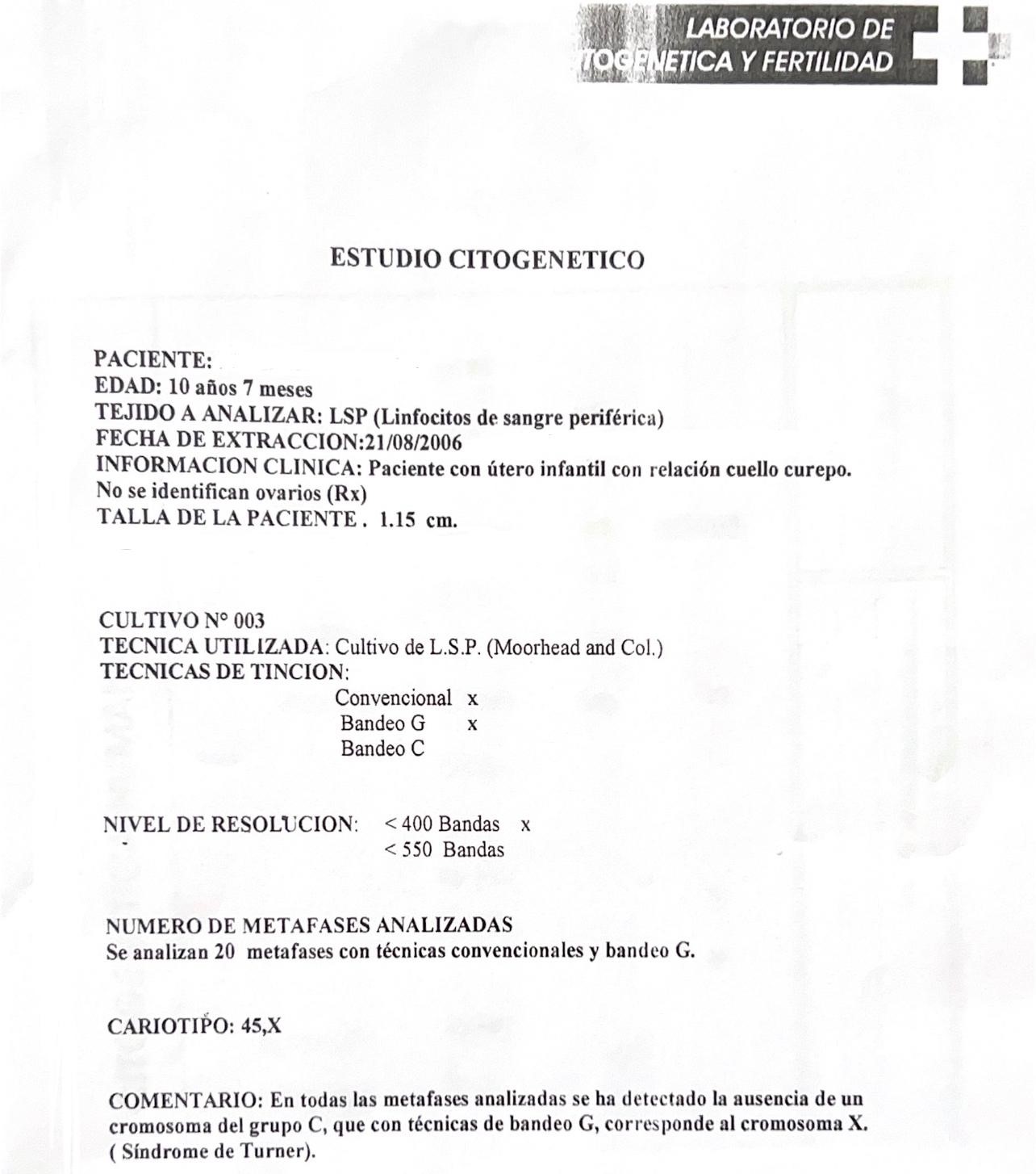 A los 9 años de edad aproximadamente, y con fecha, 21 de agosto del año 2006 acude con sus padres al Hospital Monte Sinaí de la ciudad de Cuenca, Ecuador, donde se confirma el diagnóstico de Síndrome de Turner, después de un reporte de estudio de laboratorio descrito como (la ausencia de un cromosoma del grupo C, que con técnicas de bandeo G corresponde al cromosoma X).