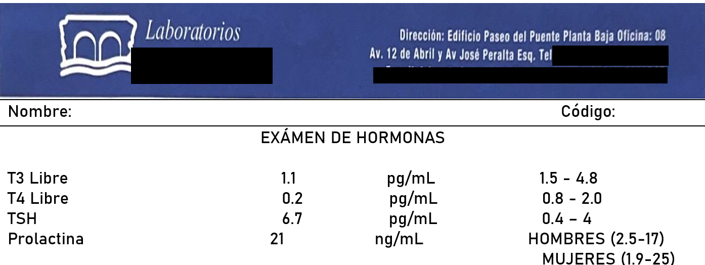 En el mismo año, después de otros exámenes generales de rutina, como biometría hemática, química sanguínea, entre otros, se solicita perfil tiroideo (TSH, T3 y T4 en su fracción libre), que al encontrarse alterado se diagnóstica de hipotiroidismo, iniciando inmediatamente terapia con Levotiroxina de 36 microgramos cada día.