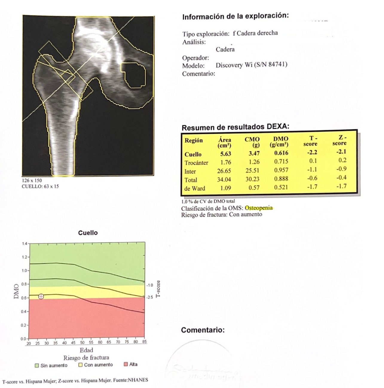 Figura 4. Densitometría ósea de cadera, donde se diagnosticó de osteopenia