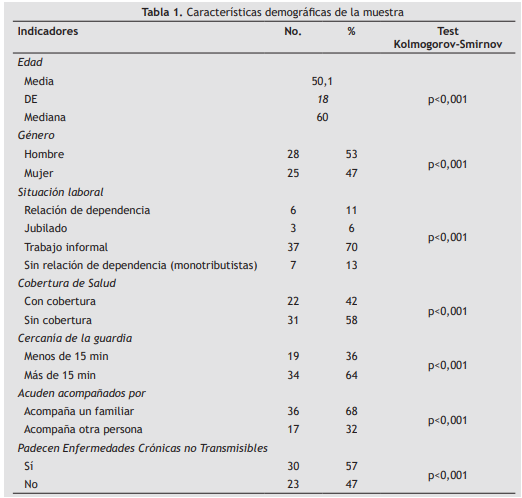 Se observó con respecto a las características generales de la muestra encuestada que, de un total de 53 personas, la edad promedio fue de 50,1 ±18 años con predominio del sexo masculino. Todas las variables sociodemográficas rechazaron la normalidad (Tabla 1).
