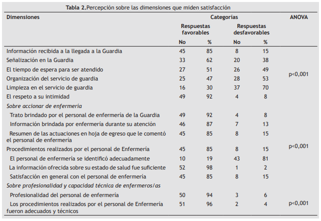 En cuanto al análisis de las dimensiones de la variable satisfacción sobre estrategias de organización y estructura en la guardia, accionar de enfermería y profesionalidad y capacidad técnica de enfermeros, se encontró diferencias significativas entre las percepciones de respuestas favorables y desfavorables (p<0,001).