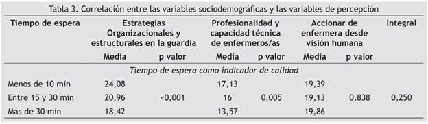 A los efectos de este estudio se destaca la relación de dependencia entre el tiempo de espera (considerado como un parámetro de calidad de atención) con las variables Estrategias organizacionales y estructurales en la guardia con mayor promedio en el ítem menos de 10 minutos de demora con una media de 24,08; p<0,001 y con Profesionalidad y capacidad técnica de enfermeros con media de 17, 13; p=0,005 (Tabla 3).