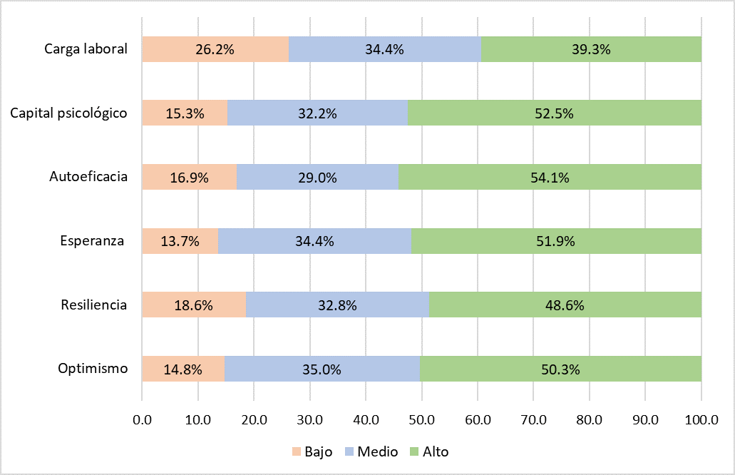 En la figura 1 se observa que el 39,3 % del total de docentes valoraron su carga laboral en un nivel alto, el 34,4 % en un nivel medio y el 26,2 % en un nivel bajo. Lo expuesto indica que los docentes se caracterizan por considerar que tienen muchas responsabilidades que cumplir en su trabajo diario, tales como la planificación de clases, la preparación de material educativo, la evaluación de los estudiantes y la gestión del aula, entre otras actividades. Esto podría tener implicaciones importantes para su bienestar y su capacidad para ofrecer una enseñanza de calidad a sus estudiantes. Respecto a la variable capital psicológico, el 52,5 % de docentes lo valoraron en un nivel alto, el 32,2 % en un nivel medio y el 15,3 % en un nivel bajo. Estos datos indican que casi la mitad del total de docentes se sienten seguros en su capacidad para enfrentar desafíos, mantienen una actitud optimista frente a las situaciones difíciles, son resilientes ante el estrés y mantienen la esperanza en el logro de sus metas profesionales.