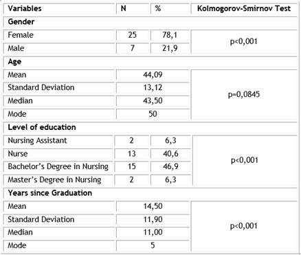 Distribution of socio-demographic variables shows a prevalence of females (78,1 %) (table 1). The mean age was 44,09 ± 13,12 (mode = 50). Almost half of the respondents (46,9 %) declared to have a bachelor’s degree in Nursing. On the other hand, the rest 40,6 % were professional Nurses. The mean years since graduation were 14,50 ± 11,9.