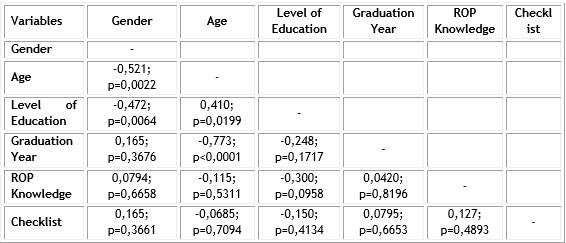 Tabla 2. Coeficiente de correlación de Spearman y nivel de significación estadística entre las variables analizadas