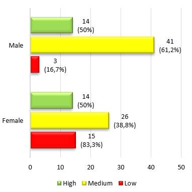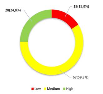 In Figure 1, it can be seen that 15,9 % (n=18) of the participants have a low quality of life, 59,3 % (n=77) a median quality of life and 24,8 %(n=28) a high quality of life.