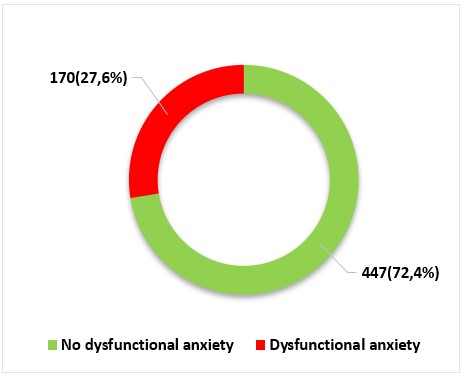 In figure 2, we can see that 72,4 % (n=447) of the participants did not present dysfunctional anxiety and 27,6 % (n=170) if they presented dysfunctional anxiety.