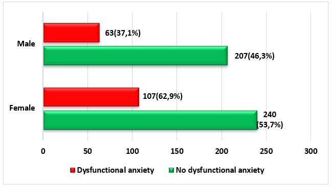 In figure 3, we can observe that, in the male sex, 37,1 % (n=63) of the participants did not present dysfunctional anxiety and 46,3 % (n=207) of the participants did not present dysfunctional anxiety; on the other hand, in the female sex, 62,9 % (n=107) of the participants if they presented dysfunctional anxiety and 53,7 % (n=240) of the participants did not present dysfunctional anxiety.