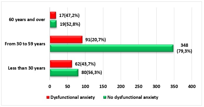 In figure 4, we can see that, in the population under 30 years of age, 56,3 % (n=80) of the participants did not present dysfunctional anxiety and 43,7 % (n=62) if they had dysfunctional anxiety; in participants aged 30 to 59 years, 79,3 % (n=348) did not present dysfunctional anxiety and 20,7 % (n=91) presented dysfunctional anxiety; and in participants aged 60 years and older, 52,8 % (n=19) did not present dysfunctional anxiety and 47,2 % (n=17) did present dysfunctional anxiety.