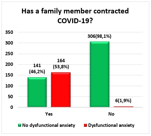 In figure 5, it can be seen that 46,2 % (n=141) of the participants maintain that one of their family members was infected with COVID-19 and that he did not present dysfunctional anxiety, however, 53,8 % (n=164) of the participants maintained that one or more members of their family if they were infected with COVID-19, therefore they came to present dysfunctional anxiety; in comparison , at 98,1 % (n=306) of the participants who did not present any member with COVID-19, did not present dysfunctional anxiety and 1,9 % (n=6) of the participants where no member of their family presented COVID-19, came to have dysfunctional anxiety.