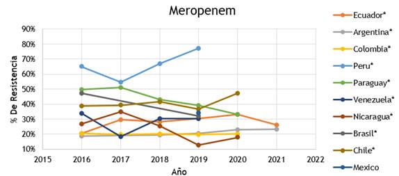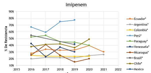 En Chile se observa que de acuerdo al boletín de resistencia antimicrobianos para el año 2016 la resistencia a meropenem es del 38,8 % y a imipenem de 37,8 %, para el 2017 se evidencia un ligero aumento a meropenem de 39,3 % y imipenem de 41,3 %, en el año 2018 sigue en aumento con una resistencia a meropenem de 41,5 % y imipenem de 42,0 %, ya en el 2019 existe una reducción a meropenem de 36,6 % y a imipenem de 36,5 % con una significancia estadística (p≤0,05), posterior a eso se evidenció un aumento para el 2020 por la aparición de la pandemia en donde meropenem presenta una resistencia al 47,1 % y imipenem de 48,9 %. Sin embargo, este país no refleja datos de resistencia superiores al 50 %.(12)