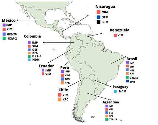 Además, los genes encontrados a nivel de América Latina productores de carbapenemasas en P. aeruginosa son blaIMP, blaVIM, blaNDM, blaGES, blaKPC, blaOXA y blaSPM, siendo los más frecuentes en Latinoamérica blaIMP y blaVIM y el gen menos reportado en este microorganismo es blaKPC en Brasil y Colombia.