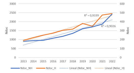 Resultados: durante este periodo, se observa un aumento gradual del número de documentos en ambos grupos. En el grupo NH, el número de documentos aumentó de 907 en 2013 a 2422 en 2022. Mientras tanto, en el grupo H, el número de documentos aumentó de 192 en 2013 a 490 en 2022. En general, se observa un aumento del número de documentos en ambos grupos a lo largo del tiempo, siendo el grupo NH el que muestra un mayor número de documentos en comparación con el grupo H en cada año. se observa que ambos grupos tienen un bajo nivel de colaboración internacional, aunque el grupo NH muestra una proporción ligeramente superior. Por otro lado, el grupo H muestra una mayor proporción de colaboración nacional y una menor falta de colaboración en comparación con el grupo NH. Ambos grupos muestran un alto nivel de colaboración institucional. Se observa una mayor heterogeneidad en ámbitos distintos del sanitario.