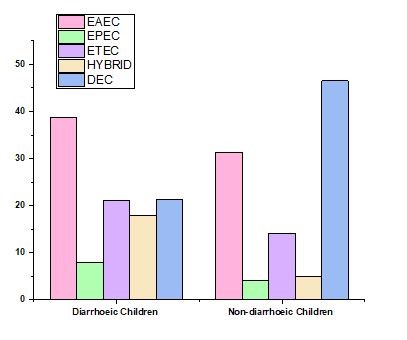 In the present investigation, 11/66 (49 %) of the isolates were classified as aEPEC (positive eae gene alone), 19/66 (31 %) as tEPEC (positive eae gene+ bfpA gene), and 31/66 (18 %) as EAEC (positive pCVD432 gene). However, co-infection was present in 5/66 (9 %) of the isolates (tEPEC + EAEC in 4 isolates and aEPEC + EAEC in 1 isolate). The research isolates did not include any EHEC, ETEC, or EIEC (figure 1). Table 2 shows the distribution of DEC types by age groups. DEC prevalence found in stool samples. Diarrheal-causing E. coli are DEC, enteroaggregative E. coli (tEPEC), typical enteropathogenic E. coli (aEPEC), enteroinvasive E. coli (EIEC), enterohemorrhagic E. coli (EHEC), and enterotoxigenic E. coli (ETEC).