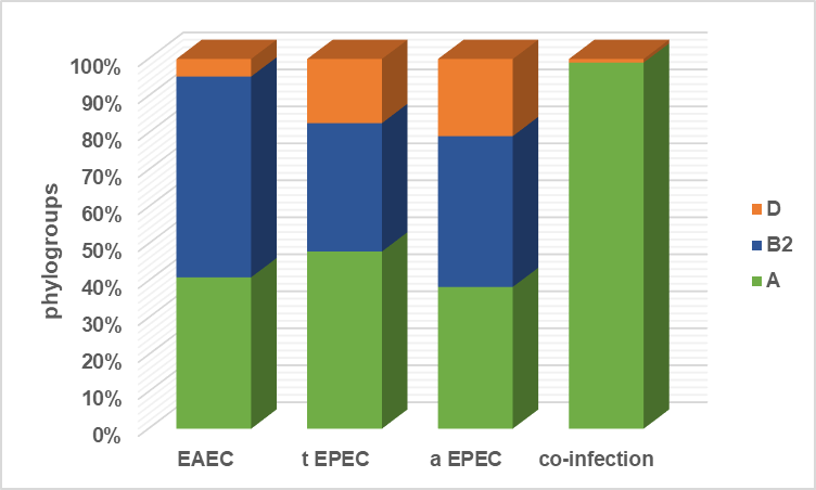 Following group B2 (29/66, 43,9 %) and group D (6/66, 9,1 %), group A (31/66, 47 %) emerged as the dominant phylogenetic group among the DEC isolates. Group B1 was not found, however. In (figure 4), and the (table 3) the distribution of phylogenetic groupings among DEC types is shown.between DEC kinds and their distribution of phylogenetic groupings. Enteroaggregative E. coli (EAEC), tEPEC, typical enteropathogenic E. coli (aEPEC), and an average enteropathogenic E. coli.