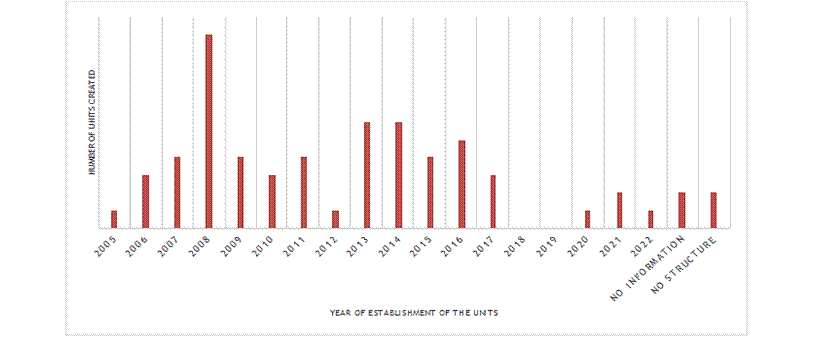 Likewise, the creation of the administrative structures has a dissimilar development, though kept over time, most of them were created in 2008 (n = 11) and in 2018 and 2019 new ones were not created, their creation in 2 establishments (figure 1) still being pending.