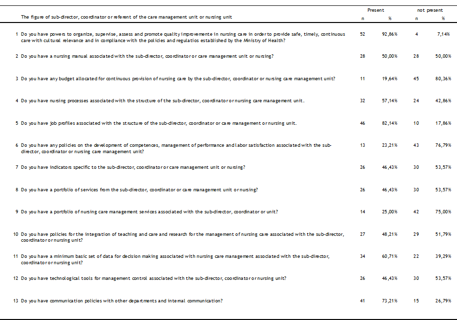 b) The second part is about characteristics of the implementation of the regulation with a resolution, such as the presence of an administrative nursing manual, the budget allocated for continuous provision of nursing care by the Assistant Directorship for Care Management (ADCM), or similar entity, nursing processes associated to the structure, job profiles associated to the structure, policy on the development of competences, management of performance and labor satisfaction, indicators proper to the ADCM, service portfolio of nursing care management, risk matrix for care management and annual improvement plan, policies on welfare teaching integration and research for care management, a minimum basic set of data for decision making, technological tools for management control, policy on communication with other offices and internal communication (manual, protocol, induction, for instance). This second part included 13 dichotomous characteristics (present or absent), 0 standing for minimum performance and 13 for maximum performance, the instrument has no cut score neither does it diagnose beyond the level of implementation.