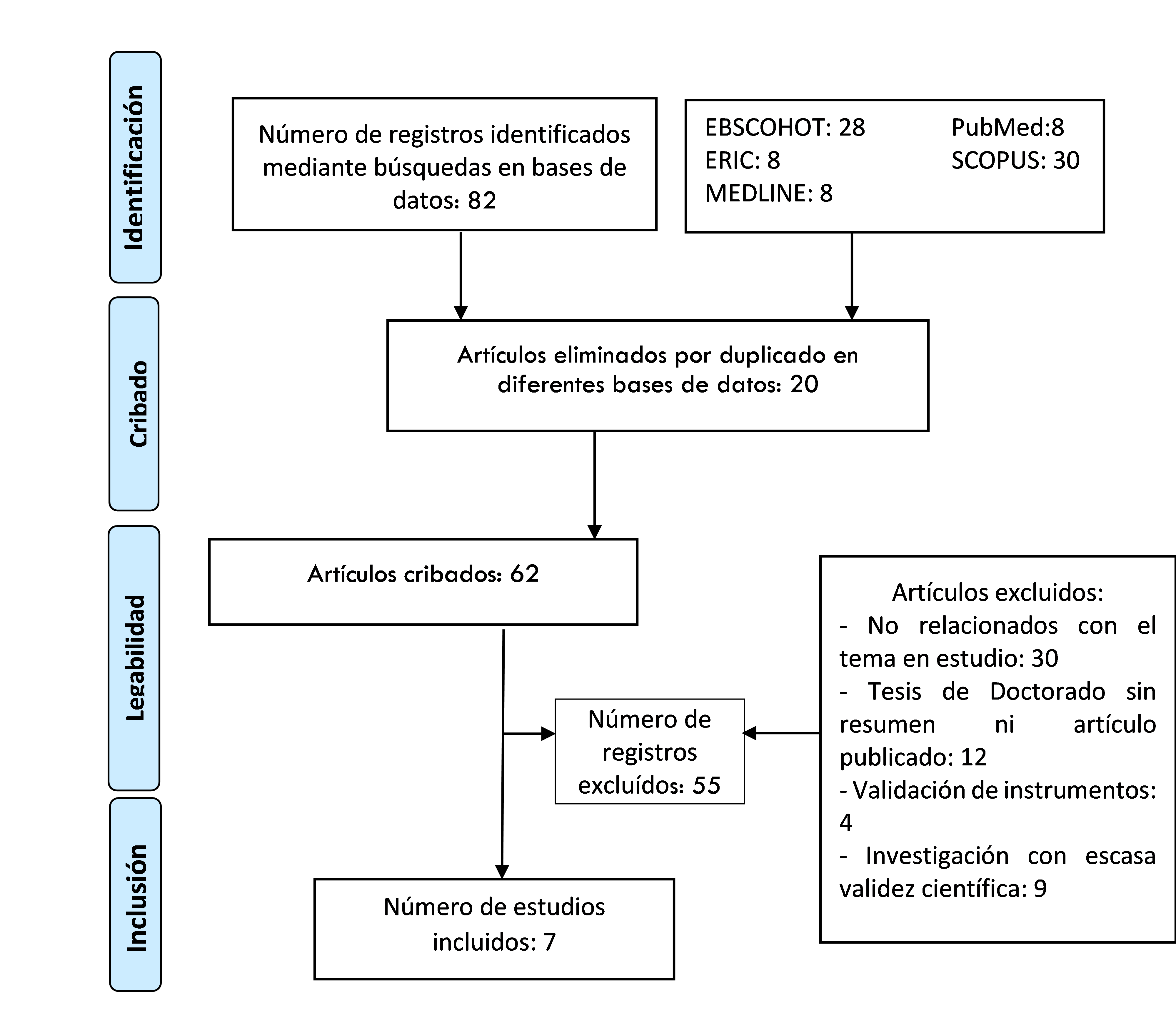 Inicialmente se identificaron 82 artículos en las 5 bases de datos referidas anteriormente. Seguidamente, se eliminaron 20 estudios por duplicado, por lo que fueron seleccionados, como siendo artículos elegibles, 60 de los 80. Finalmente, restaron 7 estudios, siendo éstos los incluidos en la revisión narrativa. Se excluyeron 55 de los 62 cribados, por diferentes motivos: artículos que no están relacionados con el tema en estudio (inteligencia emocional y espiritualidad en contextos sanitario y educativo); tesis de Doctorado sin resumen ni publicación en revista científica; estudio relacionado con la validación de instrumentos e investigaciones con poca o escasa validez científica.