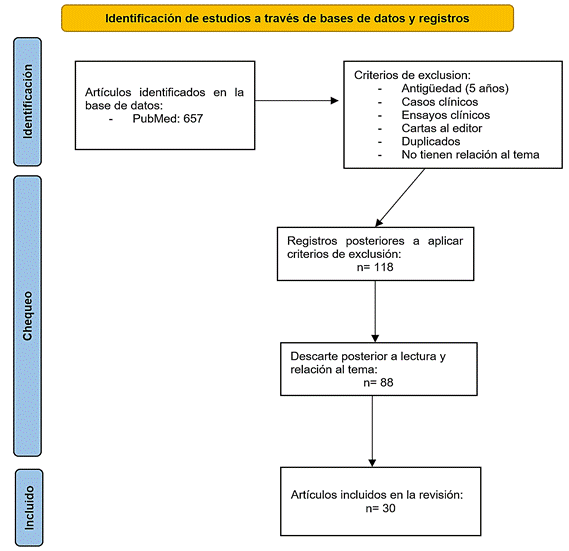 Método: se utilizó el motor de búsqueda PubMed junto a operadores booleanos y descriptores en el idioma inglés. En base a los resultados de la búsqueda se determinó mediante selección según implicación en la temática, a los artículos a incluir dentro de la revisión.