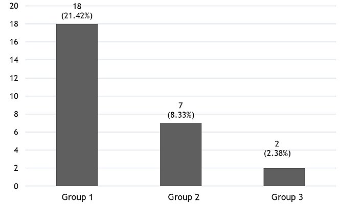 As shown in figure 1, positive findings were observed in 27 patients included in the study. The highest proportion was found in group 1 with 21,42 % (18 patients). There was an association between the groups and the presence of positive findings in the patients, and although this was statistically significant for the three groups, the magnitude was greater for groups one and two.