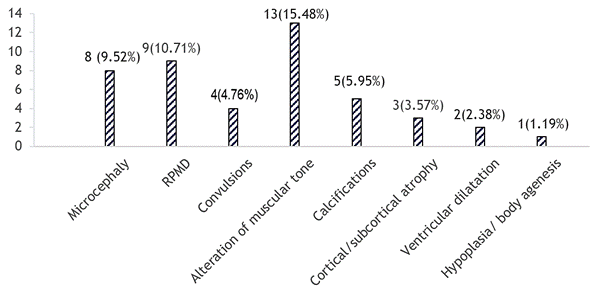 Considering all positive findings (N=69), approximately 66 % (N=46) showed neurologic signs, as observed in figure 2; those related to muscular tone were found in 13 patients (15,48 %). It is important to point out that two cases had axial hypotonia combined with that of the limbs. In second place, we found retardation of psychomotor development (RPMD) in nine cases (10,71 %) and microcephaly in eight cases (9,52 %). In four patients with microcephaly, the diagnosis was carried out during the prenatal stage. On applying Spearman’s correlation (trimester of pregnancy and microcephaly) the result was – 0,396 (a significant correlation at p ≤ 0,01 [bilateral]).