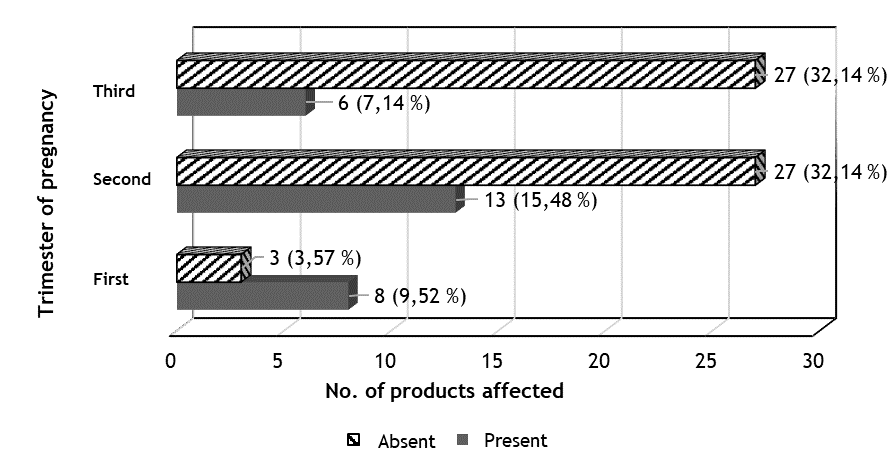 On analyzing the distribution of the cases, considering the trimester of pregnancy at which the Zika virus infection diagnosis was carried out in the mothers, it is noteworthy that there was a prevalence of the second trimester (40 cases, i.e. 47,6 %), while in the first and third trimesters there were 11 ( 13,1 %) and 33 (39,29 %) cases, respectively.