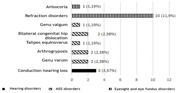The second most frequent clinical signs were visual disabilities (13 %), including myopia with the largest number, i.e. 10 patients, of which two had the combination of myopia and astigmatism. They were followed by the MSS disorders in general, with seven cases. In relation to the congenital dislocation of the hip, we found a bilateral presentation in two cases. Concerning hearing, we only found conduction hearing loss, which was bilateral in two cases and unilateral in the other case (figure 6).
