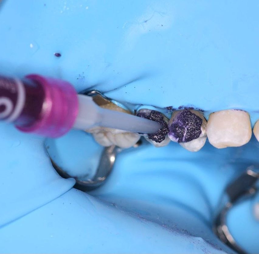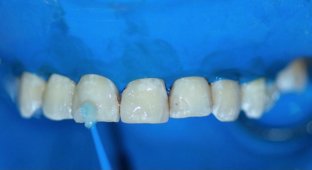 Figura 2. Colocación el material de microabrasión Opalustre sobre el esmalte en las caras vestibulares de los dientes anterosuperiores