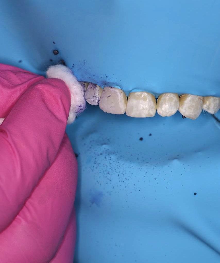 Tras ejecución del aislamiento absoluto del campo operatorio y profilaxis con piedra pómez el material de microabrasión Opalustre fue colocado sobre el esmalte de las caras vestibulares de los dientes anteriores, tras espera de un minuto aguardando se produzca la erosión, a través de una presión suave con puntas de goma suaves (OpalCups) mediante contraángulo durante un minuto el material fue distribuido uniformemente sobre las superficies (figura 2).